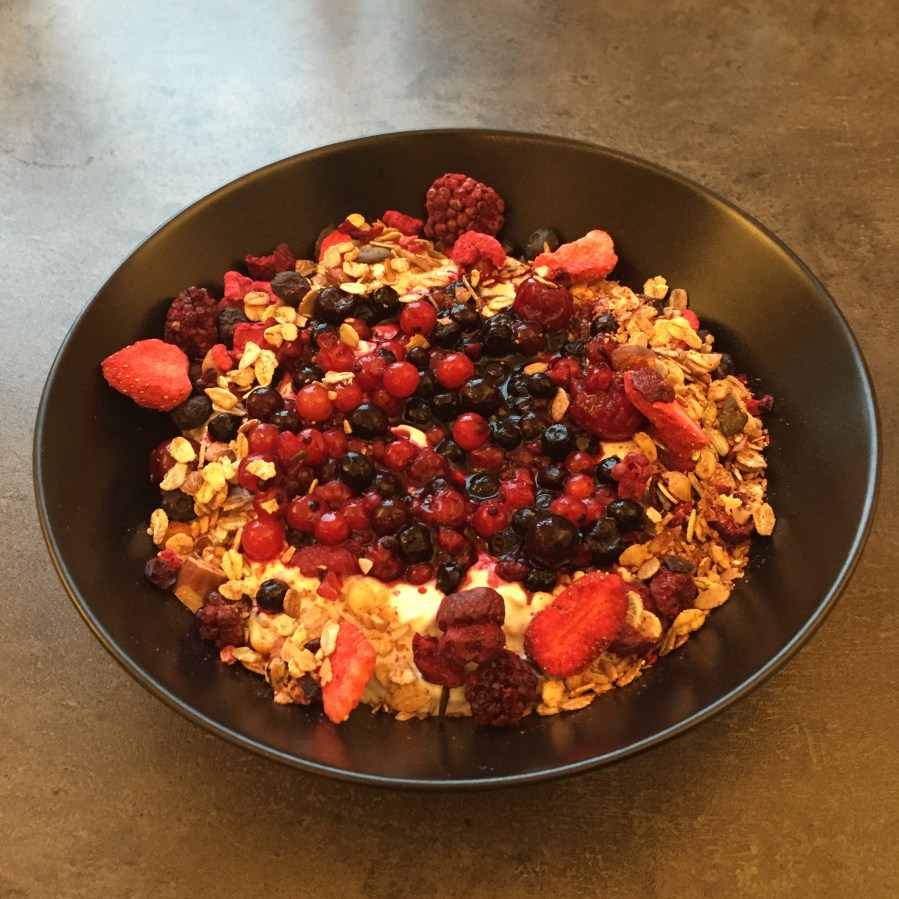 Hier kommt unser erstes richtiges Müsli-Gericht am Müslimittwoch. Verwendet haben wir natürlich unsere selbstgemacht Rote Müslimischung. Da es aktuell noch keine lokalen frischen Beeren gibt, haben wir Tiefkühlware verwendet.
