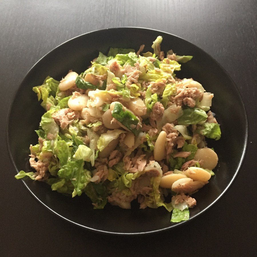Die Bohnen über Nacht in Wasser einweichen und am nächsten Tag in reichlich ungesalzenem Wasser für 1-1 1/2 Stunden kochen bis sie weich sind. Die Bohnen anschließend abgießen und kurz mit kaltem Wasser abschrecken. Den Salat waschen, belesen und in kleine Stücke schneiden. Den Thunfisch abtropfen lassen und zusammen mit dem Salat und den Bohnen in einer großen Schüssel vermengen. Mit Essig, Öl, Salz und Pfeffer abschmecken und genießen.