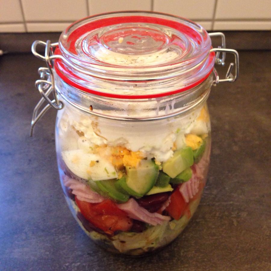 Nun den Eissalat in ein Gefäß, z.B. ein Einmachglas geben. Mit etwas Salz, Pfeffer sowie Öl und Essig würzen. Die Bohnen sowie die Tomaten darauf geben, nochmals etwas Salz und Pfeffer darauf geben. Jetzt Schinken, Avocado und Eier der Reihe nach in das Glas schichten mit dem Hüttenkäse abschließen und zuletzt wieder etwas Salz und Pfeffer darauf geben.