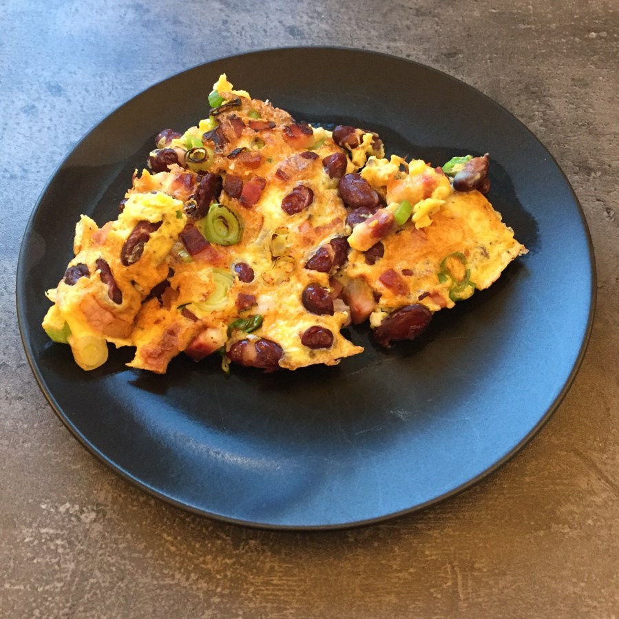So hatten wir hier vom Vorabend noch ein paar Frühlingszwiebeln übrig, die natürlich super in ein Rührei mit Bauchspeck (Dörrfleisch) und Kidneybohnen passen. Die Frühlingszwiebeln verliehen dem Gericht eine leckere und frische Note.