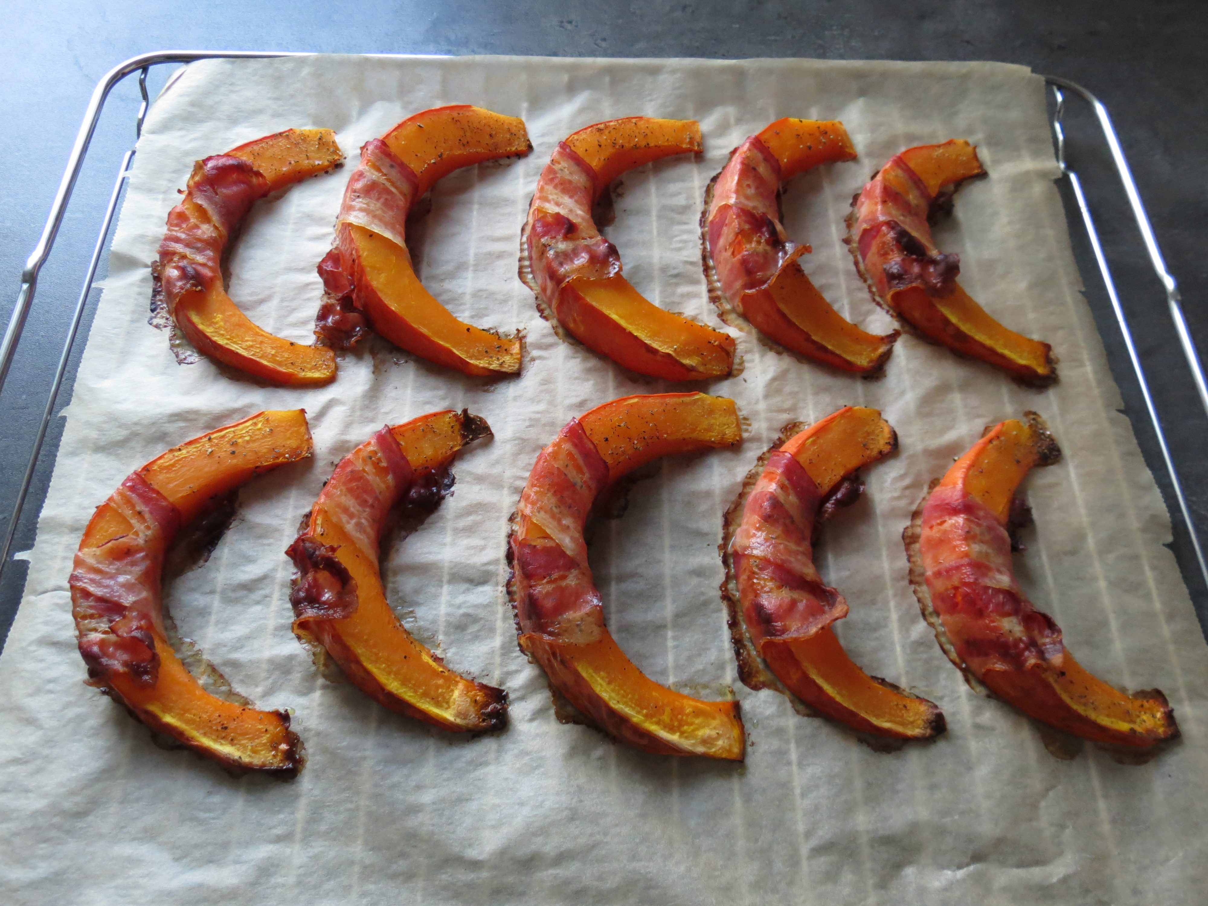 Bacon-Kürbisspalten nach dem Backen am 23. September 201624. September 2016 von Neurotoxicum Bacon-Kürbisspalten nach dem Backen auf dem Rost