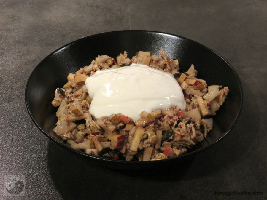 Etwas aufwändiger, aber gut vorzubereiten ist dieser leckere Bircher-Porridge. Er enthält im Gegensatz zu unserem Birchermüsli in der Grundmasse kein Joghurt oder Quark. Wir haben dies hier lediglich als Topping oben auf getan, was allerdings natürlich kein Muss ist.