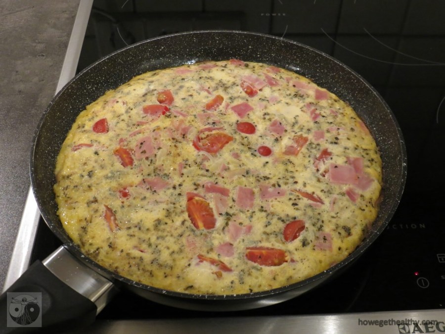 Normalerweise braten wir die einzelnen Zutaten für unsere Rühreier oder Omlettes ja vorher in der Pfanne an bevor wir das Ei darübergeben. Heute haben wir einfach mal alles in eine Schüssel geworfen, vermischt und in die heiße Pfanne gegossen – funktioniert super!