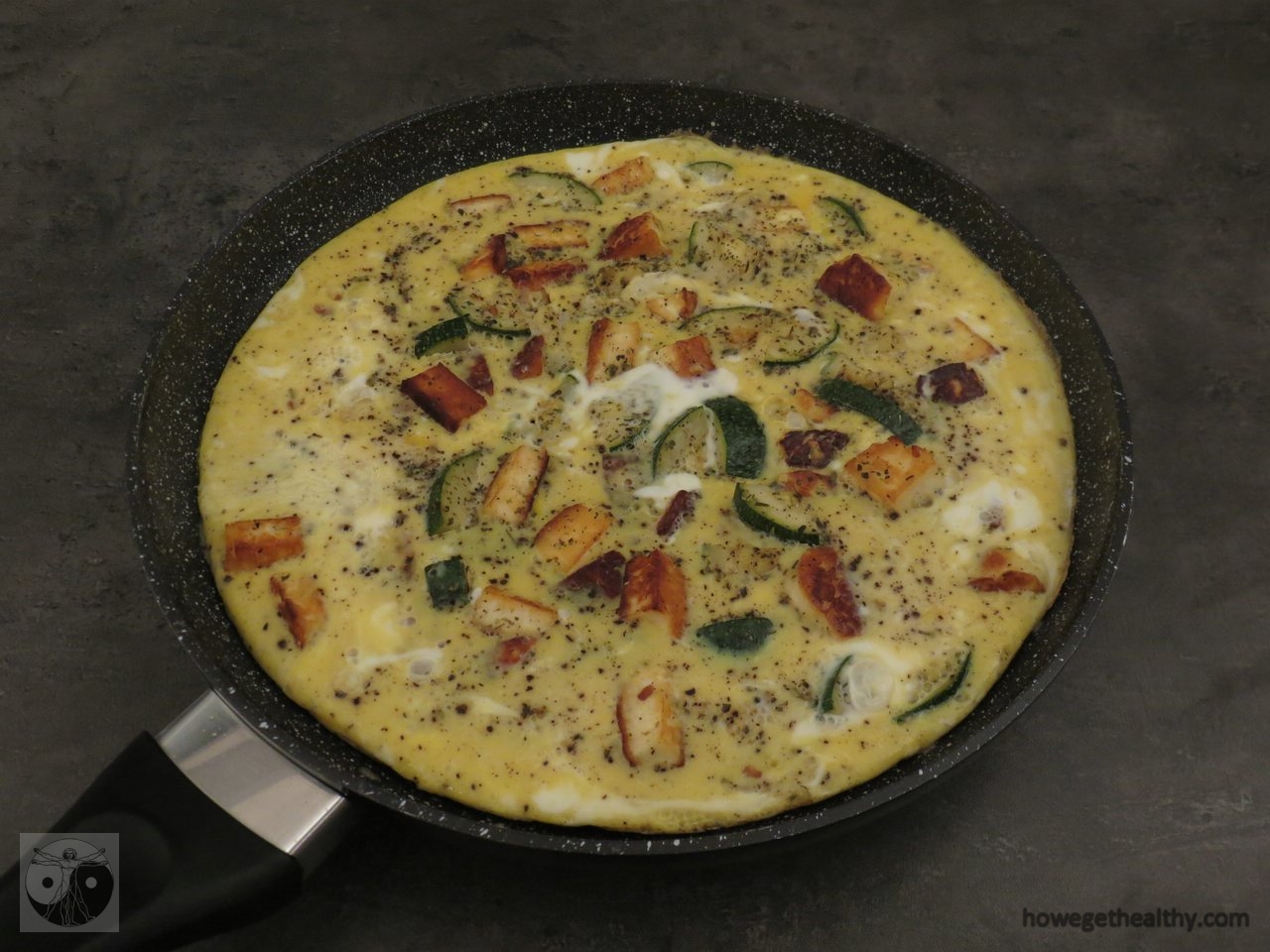 Rührei mit Halloumi in der Pfanne am 6. November 20166. Dezember 2016 von Neurotoxicum Süßkartoffel-Bacon-Auflauf vor dem Backen