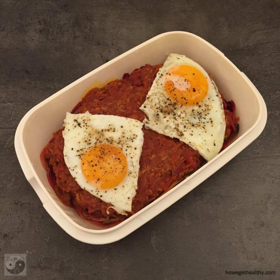 Da die letzten beiden Portionen etwas kleiner ausgefallen sind (und weil wir keinen Feta mehr hatten) haben wir hier noch Spiegeleier ergänzt.