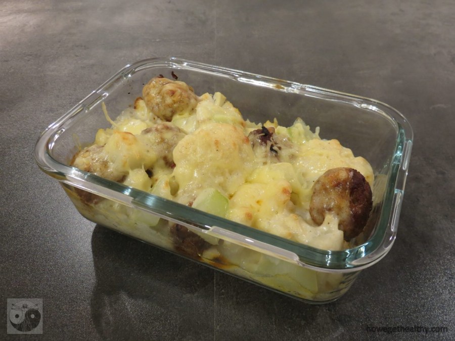 Die Idee für diesen Auflauf stammt von „Abnehmtipps und Abnehmtricks“. Wir haben nach unserem Geschmack ein paar Veränderungen vorgenommen und so lautet unsere Version des leckeren Gemüseauflaufs mit Hackbällchen und Käsesoße: