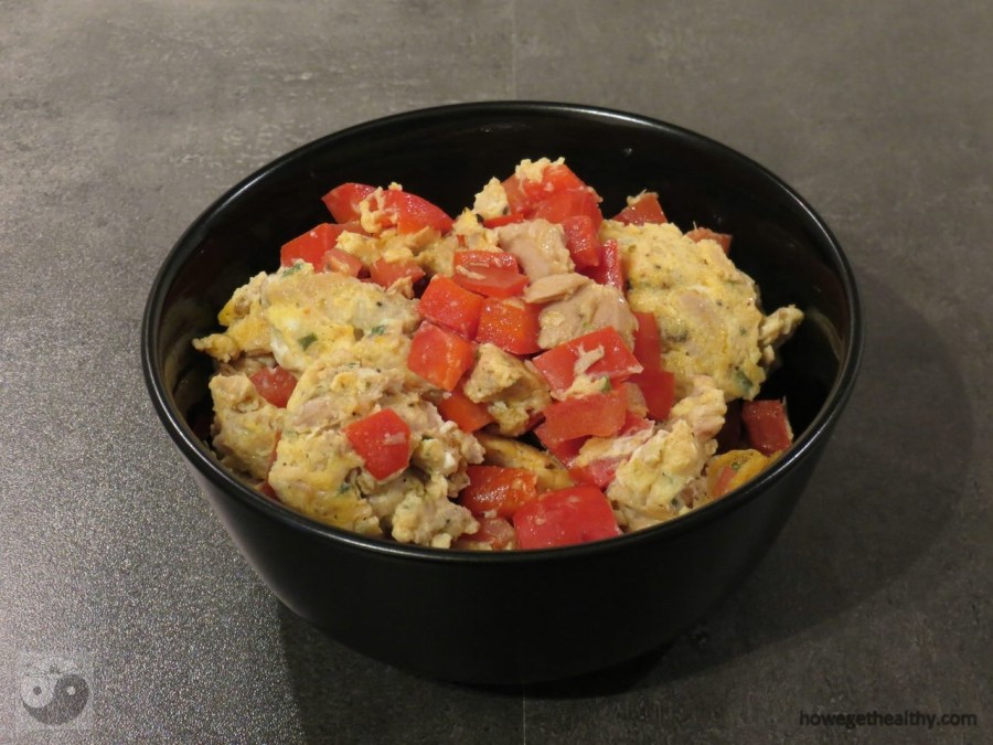 Wer mit einer großen Portion Proteinen gut in den Tag starten möchte, ist bei diesem Rezept genau richtig. Neben Eiern kommt hier auch Thunfisch mit auf den Frühstücksteller. Geschmacklich aufgelockert und abgerundet wird das Ganze durch Tomaten- und Paprikawürfel.
